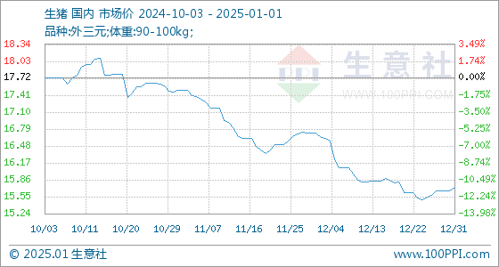 1月1日,生意社生猪基准价为15.72元/公斤,与上月初(16.72元/公斤)相比,下降了-5.98%。