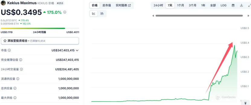 CoinGecko数据显示,在马斯克更改昵称前,Kekius Maximus价格在0.0112美元附近,更改昵称后,Kekius Maximus价格一路飙涨,2024年12月31日当天就涨了9倍以上。2025年1月1日,Kekius Maximus价格继续上涨,最高触及0.40美元。目前,Kekius Maximus价格在0.3495美元附近震荡,总市值超过3.3亿美元,较马斯克更新昵称前上涨了超3000%。