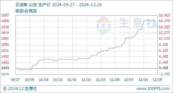 12月26日,生意社石油焦基准价为1642.50元/吨,与本月初(1540.25元/吨)相比,上涨了6.64%。