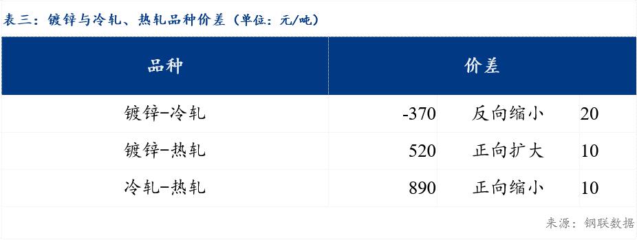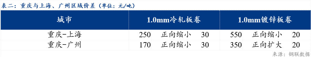 重庆、上海地区冷轧板卷区域价差缩小30元/吨,重庆、广州冷轧板卷区域价差正向缩小30元/吨;重庆、上海镀锌板卷区域价差缩小20元/吨,重庆、广州镀锌板卷区域价差扩大20元/吨。镀锌、冷轧品种价差反向缩小20元/吨;镀锌、热轧品种价差扩大10元/吨;冷轧、热轧品种价差缩小10元/吨。