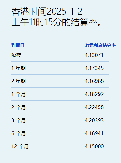 年结过后,港元拆息于2025年首个交易日全线走软。其中,隔夜息大跌1.51基点至4.13071%,为2024年12月23日以来最低,而与楼按相关的一个月拆息亦连跌两天,报4.18929%,为11月26日以来最低。