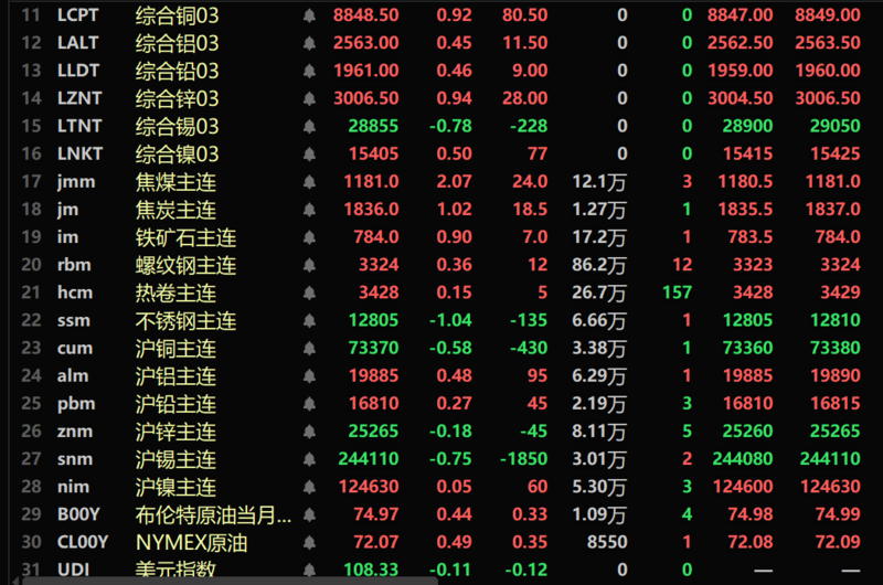 黑色系多飘红,铁矿涨0.9%,螺纹涨0.36%,热卷涨0.15%。不锈钢跌1.04%。双焦方面,焦煤涨2.07%,焦炭涨1.02%。