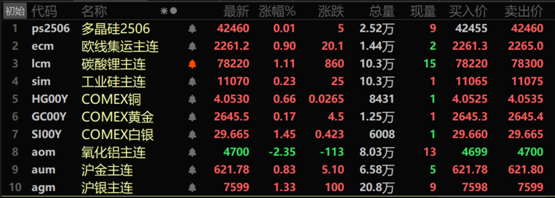 此外,氧化铝跌2.35%。碳酸锂涨1.11%,工业硅涨0.23%。多晶硅期货微涨。
