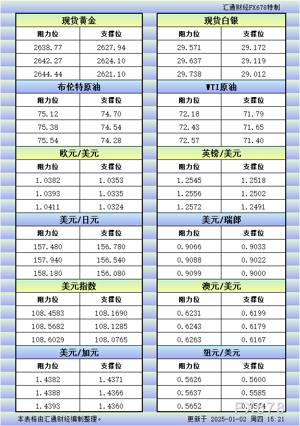 汇通财经APP讯——1月2日欧市更新的黄金、白银、原油、美元指数、欧元、英镑、日元、瑞郎、澳元、加元、纽元支撑阻力位一览。