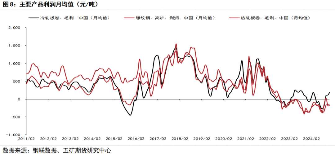 从钢厂的角度来说,可用资金会限制其补库空间。根据钢联口径的利润测算,近两年主要品种利润并不理想,在此情况下,钢厂的冬储规模与利润丰厚时不可同日而语,资金不充裕的情况下补库的空间会受到限制。