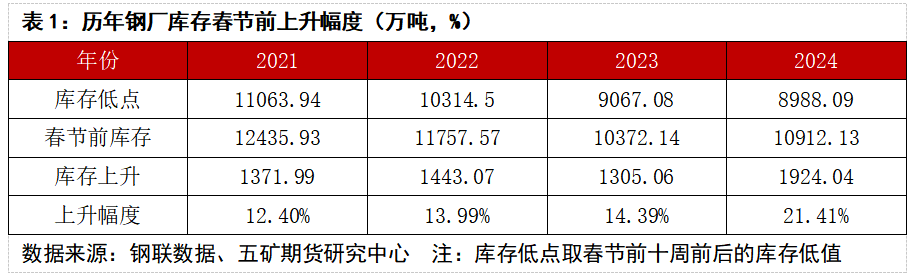 根据近五年季节性推演,以及去年冬季补库的后续情况。在年初冬储效果不佳,钢厂利润相对一般,资金不充裕的情况下,冬储幅度要想与去年匹配可能性不高,预计最终库存向上幅度在14%-15%左右。从补库的时间来说,今年冬季气温整体偏暖,天气对运输影响减弱,同时港口库存较高,补库时间较往年或有所后移,库存斜率陡峭阶段更靠近于春节。