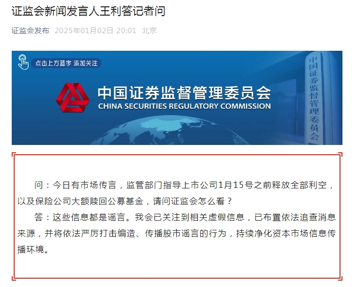 2日晚间,证监会紧急回应了“1月15号之前释放全部利空”、“保险公司大额赎回公募基金”等传言,证监会新闻发言人王利表示这些信息为谣言,证监会已关注到相关虚假信息,已布置依法追查消息来源,并将依法严厉打击编造、传播股市谣言的行为,持续净化资本市场信息传播环境。