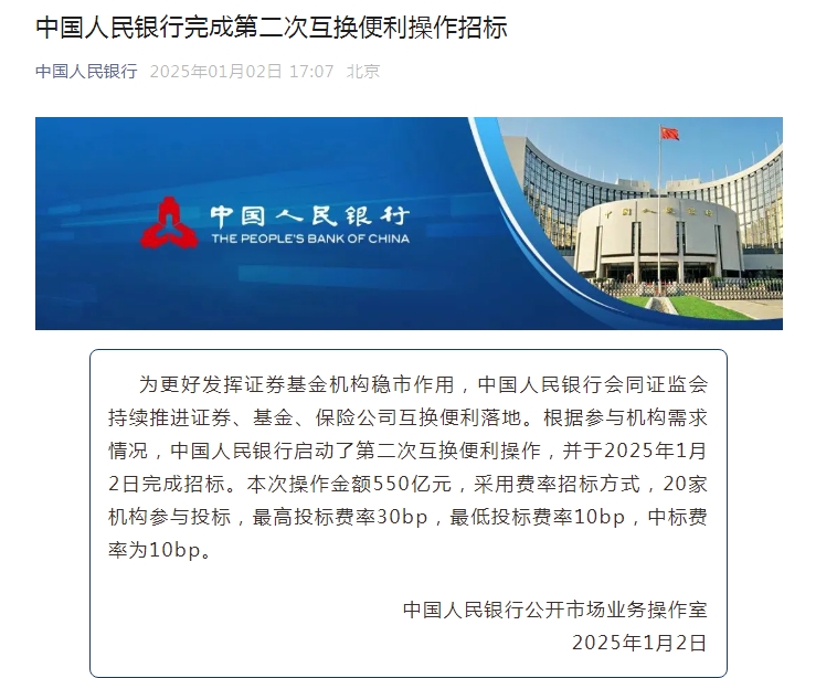 今日稍早之前,央行已经释放利好消息来呵护市场,据央行官消息,为更好发挥证券基金机构稳市作用,会同证监会持续推进证券、基金、保险公司互换便利落地。根据参与机构需求情况,启动了第二次互换便利操作,并于2025年1月2日完成招标。本次操作金额为550亿元,采用费率招标方式,20家机构参与投标,最高投标费率30bp,最低投标费率10bp,中标费率为10bp。