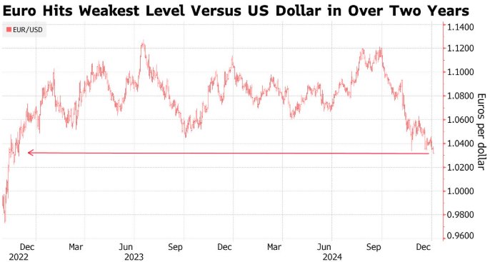 智通财经获悉,欧元兑美元汇率跌至两年多来的最低水平,市场对欧洲经济以及与美国的货币政策分歧感到担忧。截至发稿,欧元兑美元下跌0.4%,至1.0314,为2022年11月以来的最低水平,自9月底以来的跌幅已扩大至8%左右。英镑的表现也落后于其他主要货币,跌至5月以来的最低水平。