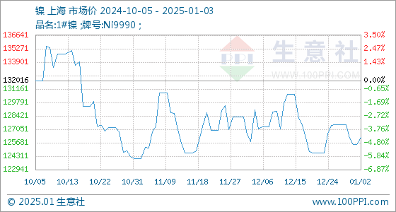 1月3日,生意社镍基准价为126208.33元/吨,与本月初(125475.00元/吨)相比,上涨了0.58%。