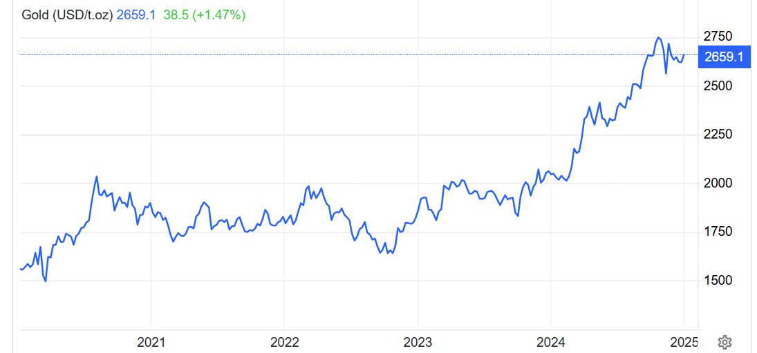 黄金价格刚刚创下自2010年以来的最大规模年度涨幅,并且在全球股市遭遇2025年伊始“开门黑”之际喜迎“开门红”,高盛、美国银行以及摩根大通等华尔街金融巨头们普遍预测2024年涨势如虹的金价在2025年将进一步上涨,非常有希望朝着3000美元这一历史最高点位奔去。