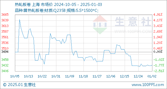 1月3日生意社热轧板卷基准价为3434.00元/吨