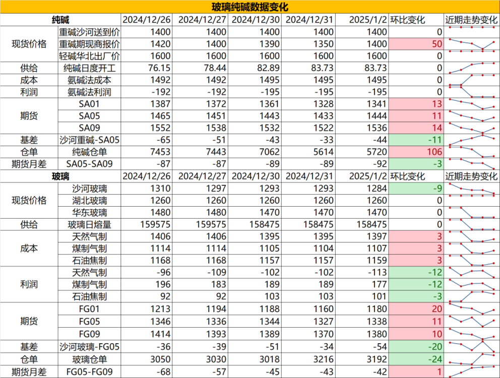 1.目前碱厂沙河送到价在1400元/吨附近,碱厂库存在144.83万吨,环比上周累库0.66万吨,库存高位震荡,由于下游节前补库基本结束,碱厂由前期待发订单导致的去库转为实质性累库,本周部分前期检修企业恢复,产量高位向上提升,下游补库结束后,后续大概率库存持续向上积累,且刚需端光伏玻璃近期仍有两条产线存在冷修计划,供需端驱动均向下。
