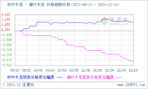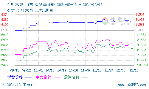 据生意社商品行情分析系统监测:本周针叶木浆和阔叶木浆均呈现小幅下行走势。12月13日针叶木浆山东地区市场均价为6250元/吨,与12月8日均价相比下降了0.32%。12月13日阔叶木浆山东地区市场均价为4448元/吨,与12月8日均价相比下降了0.67%。