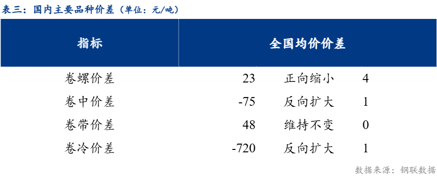 从品种价差来看,卷螺差较上一交易日正向缩小4元/吨,热中价差较上一交易日反向扩大1元/吨,热带价差较上一交易日维持不变,热冷价差较上一交易日反向扩大1元/吨 。