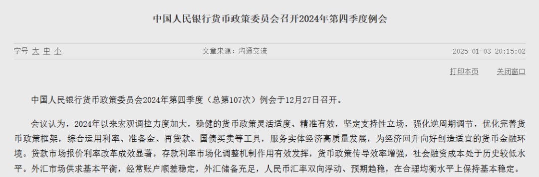中国人民银行网站2025年1月3日消息,中国人民银行货币政策委员会2024年第四季度(总第107次)例会于2024年12月27日召开。会议研究了下阶段货币政策主要思路,建议加大货币政策调控强度,提高货币政策调控前瞻性、针对性、有效性,根据国内外经济金融形势和金融市场运行情况,择机降准降息。
