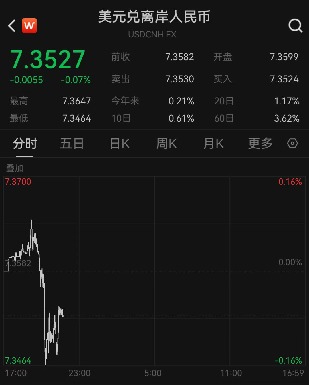 当天早盘,离岸人民币兑美元一度收复7.35关口。