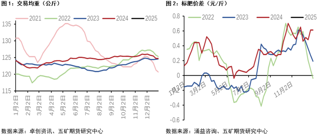 去年2月份开始出生仔猪数据明显转暖,对应到8月下半月理论出栏量显著攀升,现货情绪8月中旬转势,此后经历9月份的二育出栏和集团供应恢复,现货从高位明显回落但仍有养殖盈利。此后市场不再抱有幻想,计划出栏和屠宰端放量从10月份提前展开,明显早于往年的11月降温以后,表明整个市场存在提前风控的集体动作。据涌益咨询,24年10-12月计划出栏环比增量分别为4.3%、1.7%和5.4%,实际完成度分别超过计划量4.2%、1.6%和6.5%,增幅显著高于供应明显过剩的22年和23年同期。如果说仅凭供应规模偏大还不足以说明供压有提前透支的情况,我们还可以从几个指标侧面观察:一是交易体重降速明显,根据卓创数据,11月和12月初交易均重为分别为125.32和125.99公斤,同比23年同期分别重1.59和1.26公斤,但是截止到今年元旦过后,交易均重已下滑至124.11公斤附近,与去年同期持平或略低,过量出猪是导致体重快速下滑最直接的原因;二是散户栏位明显下降,二育大省山东和江西栏位利用率分别下降至24%和23%,低于去年同期的35%和38%,也低于去年春节后低点的24%和25%,表明散户亦在过度恐慌中提前将筹码砸出;三是标肥差反季节性走高,传统冬至腌腊季后大猪需求下滑,标肥差从高位回归,但今年冬至后大猪持续坚挺,标肥差不落反升,大猪偏紧佐证活体库存得到一定程度的提前出清。