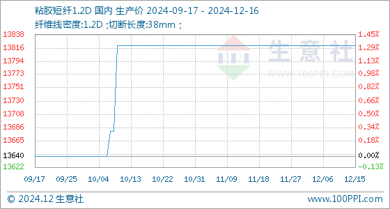 12月16日,生意社粘胶短纤1.2D基准价为13820.00元/吨,与本月初持平。