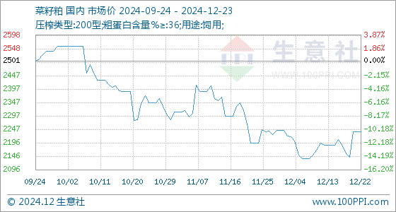 12月23日,生意社菜籽粕基准价为2238.33元/吨,与本月初(2243.33元/吨)相比,下降了-0.22%。