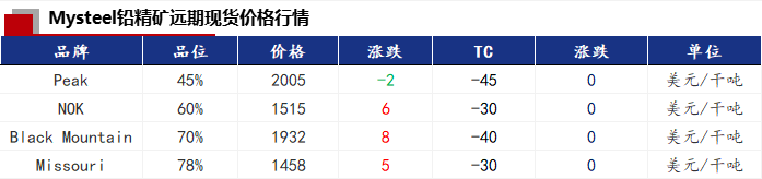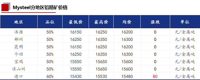 今日受铅锭价格影响,铅精矿价格较上一交易日持平元/金属吨。铅精矿加工费各地区均未调整,较上一交易日持平。进口铅精矿价格较上一交易日涨80元/金属吨。