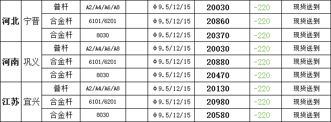 1月6日宁晋市场普铝杆现货报盘价20030元/吨,较上一交易日报价跌220元/吨;巩义市场普铝杆现货报盘价20030元/吨,较上一交易日报价跌220元/吨;宜兴市场普铝杆报盘价20130元/吨,较上一交易日报价跌220元/吨。
