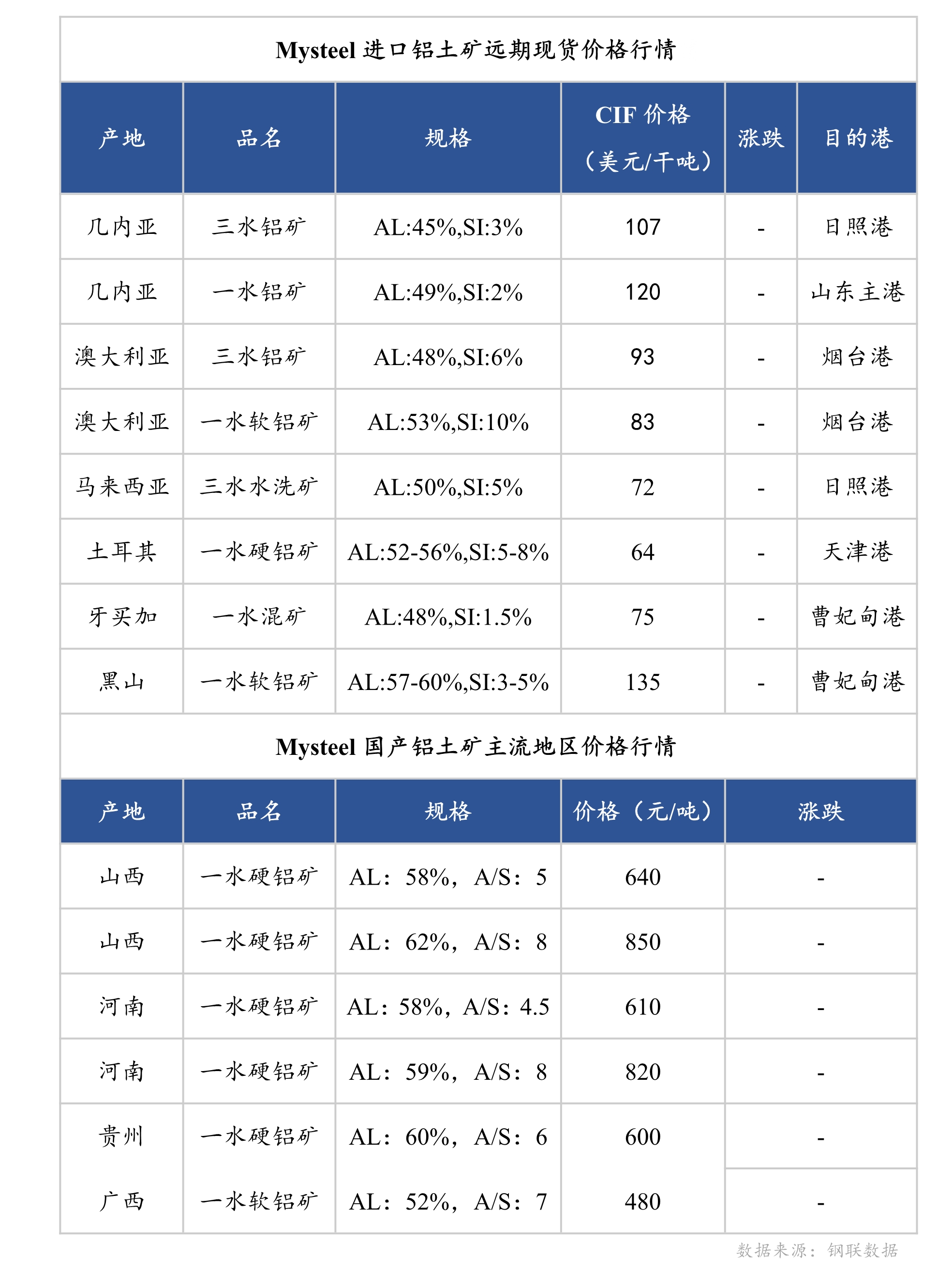 1月6日国产铝土矿价格平稳运行。国产矿山维持常态开工,采暖季环保压力增加,下游氧化铝企业国产矿库存始低位,现货难寻支撑国产矿现货报价坚挺。