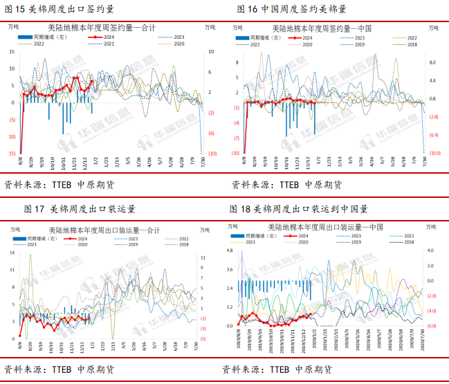 出口情况,截至12月底,中国进口减少,东南亚进口增长。截至12月19日,2024/25美棉陆地棉和皮马棉总签售量175.2万吨,占年度预测总出口量(246万吨)的 71%,同比减少7%;累计出口装运量61.4万吨,占年度总签约量的35%,同比减少7%。其中巴基斯坦采购38.1万吨,同比增28%;越南采购32.7万吨,同比增119%;土耳其采购18.6万吨,同比增69%;中国采购15.4万吨,同比减少78%;印度采购9.1万吨,同比增357%,孟加拉采购7.6万吨,同比减少33%。近年美棉丰产,但出口进度慢,东南亚采购增加,中国需求疲软。