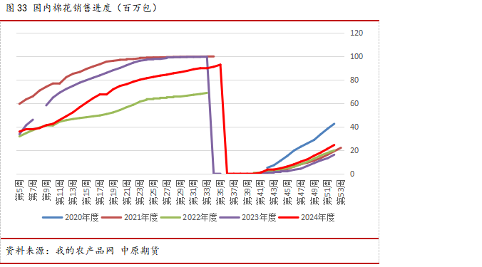 销售进度好于前三年。截至到12月27日,新棉销售进度24.5%。虽然销售进度快于前三年,但在今年大幅增产背景下,销售偏慢,显示下游需求偏弱。