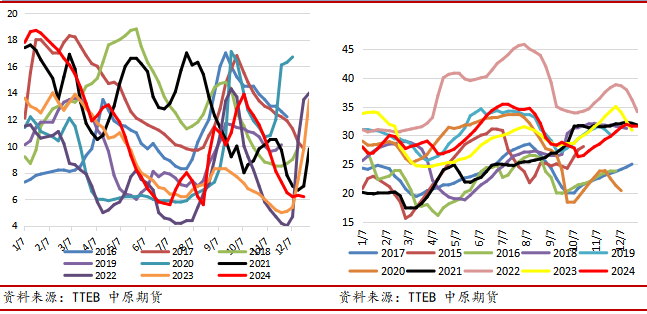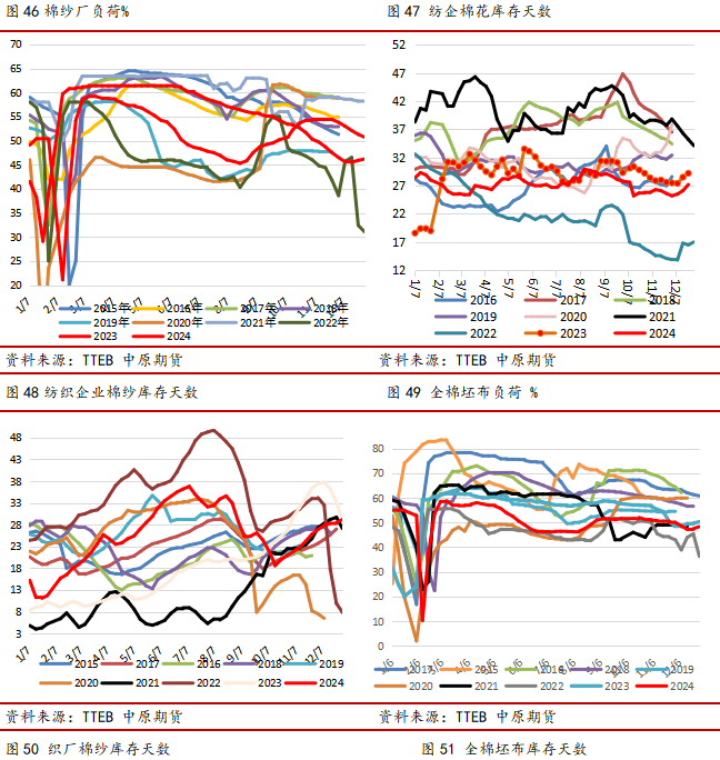 2024年金三银四旺季需求提振在春节前释放,金九银十需求弱于预期。当前国内下游淡季特征延续,纺织企业出货缓慢,企业经营及资金压力较大,开机率持续下滑,对原料的备货未出现明显放量,部分纺企有提早放假计划。从下游原料库存看,织造厂原料库存处于低位,若需求启动,将带来棉纱原料的补库,则纺织厂棉纱库存将下降,另外棉纱贸易商也将补库带动纱厂产成品库存的下降,鉴于纱厂库存偏高,所以传导到棉花的需求的滞后期会长一点。