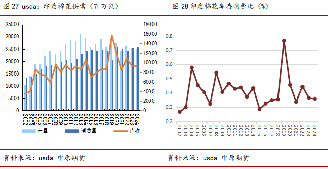 24/25年度减产。印度棉花协会(CAI)对印度2024/25年度棉花供需预估显示,印度棉花产量预估为3022.5万包,比上年度的3252.9万包减少7%。棉花进口量为250万包,高于上年度的152万包,增幅64.47%。Usda预计本年度印度棉花产量2500万包,同比减40万包,降幅4.58%;进口量230万包,同比增141万包,增幅160%;消费量2600万包,同比增50万包,增幅2%,库存930万包,同比稳定。