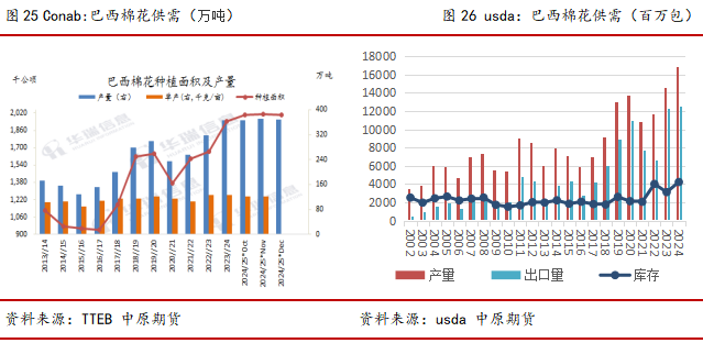 Usda数据显示,24/25年度巴西棉花将继续增产增库存。产量将达到1690万包,同比增233万包,增幅16%;出口量1250万包,同比增19万包,增幅2%;库存422万包,同比增111万包,增幅36%。