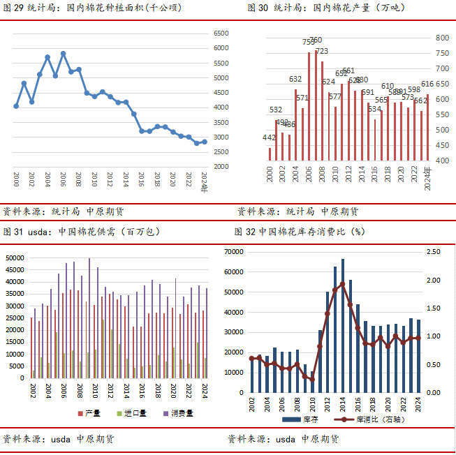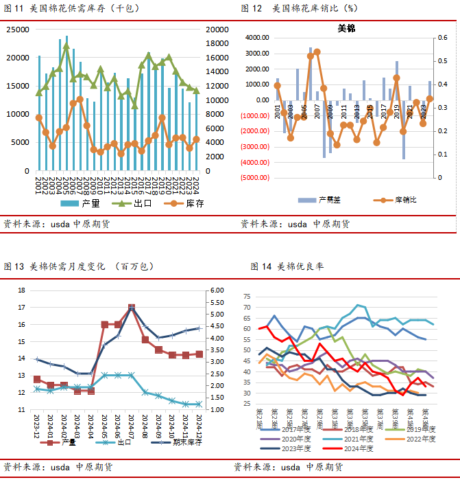 24/25年度美棉增产增库存,供给极大程度恢复。棉花种植面积1097万英亩,同比增加8.9%。收获面积844万英亩,较 2023 年增长34%。12月usda供需报告显示,2024/25年度美国棉花产量预计1425万包,同比增加219万包,增幅18%;出口量1130万包,同比减少3.8%;美国期末库存440万包,同比增加40%,库存攀升至2009年以来的次高位水平;库存消费比上升到33%,提高10个百分点。