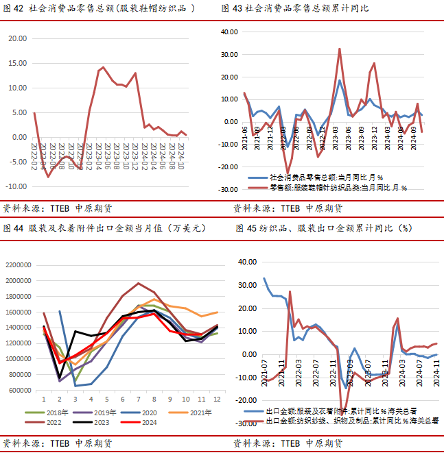 内需看,受宏观经济波动,消费者收入下降,信心下降,国内纺织服装需求放缓,家纺服装企业库存天数增加,利润下降。前11个月我国服装鞋帽、针、纺织品类累计零售额为13073亿元,同比增0.4%。2024年纺织服装内需增长动能趋弱,预计此种情况将延续至2025年,国内居民收入没有得到有效提高前,对家纺服装需求仍会谨慎。
