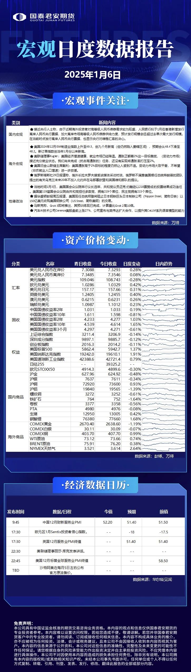 国债期货:昨日国债期货TS、TF合约表现清淡,T、TL合约则低开高走。从机构净多头持仓来看,开年第一周配置类机构整体偏谨慎,认为债市已计入降息预期,但私募类机构看到调整后对于TL合约主动左侧买入力量较强。当前超长久期的基差以及30-10的利差处于正常分位,存在进一步压缩可能性,这也是昨日TL合约表现较强的原因。从股债跷跷板来看,当前负相关性仍强,权益市场情绪偏脆弱,叠加一季度为季节性债市配置高峰,因此债牛氛围仍在,方向上看震荡偏强。外部特朗普辟谣华盛顿邮报关税仅针对特定商品的消息,夜盘A50拉升后回落,外部情绪传导上仍然对债市偏利多。时空上看,特朗普上台在即,且农历新年即将来临,国内政策偏真空,整体债市在潜在降息可能性与央行阶段性的降温干预下或震荡上行,季度末两会后债市或迎来调整可能性,但拉长看仍然维持“长期重趋势,短期防波动”的观点。