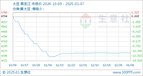1月7日,生意社大豆基准价为4144.00元/吨,与本月初持平。