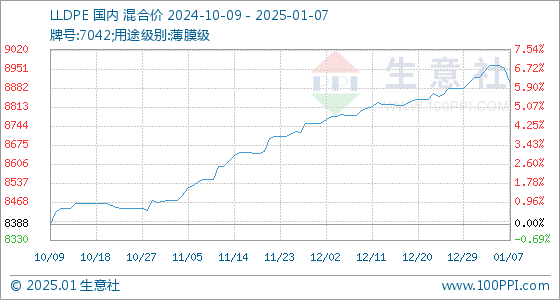 1月7日,生意社LLDPE基准价为8955.00元/吨,与本月初(8921.67元/吨)相比,上涨了0.37%。