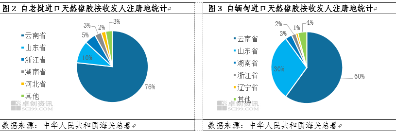 前11月自老挝进口天然橡胶收发地中,云南省累计进口21.88万吨,占比76%,位居首位;山东省累计进口2.88万吨,占比10%,位居第二;浙江省累计进口1.52万吨、湖南省累计进口0.98万吨位居三、四位。前11月自缅甸进口天然那橡胶收发地中,云南省累计进口20.82万吨,占比60%,位居首位;山东省累计进口10.4万吨,占比30%,位居第二位;湖南省累计进口0.99万吨、浙江省累计进口0.66万吨位居三、四位。