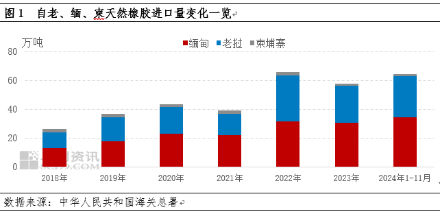 2024年1-11月中国自缅甸进口天然橡胶34.45万吨,同比增长6.12万吨,涨幅21.6%,为历史同期最高水平。2024年1-11月自老挝进口天然橡胶28.74万吨,同比增长7.1万吨,涨幅32.81%。同期自柬埔寨进口天然橡胶1.46万吨,同比微增0.03万吨,涨幅2.1%。