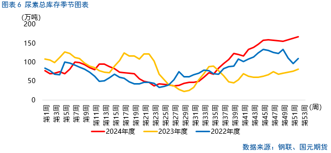 尿素企业库存环比上涨,持续创下年内新高,同比居于近三年同期高位。截至2024年12月25日,尿素企业总库存量152.50万吨,较上周增加5.32万吨,环比增加3.61%。尿素整体港口库存窄幅下降,主要是大颗粒尿素货源零星离港,小颗粒尿素维持不变。截至2024年12月26日,中国尿素港口样本库存量为15.4万吨,环比减少0.2万吨,环比跌幅1.28%。