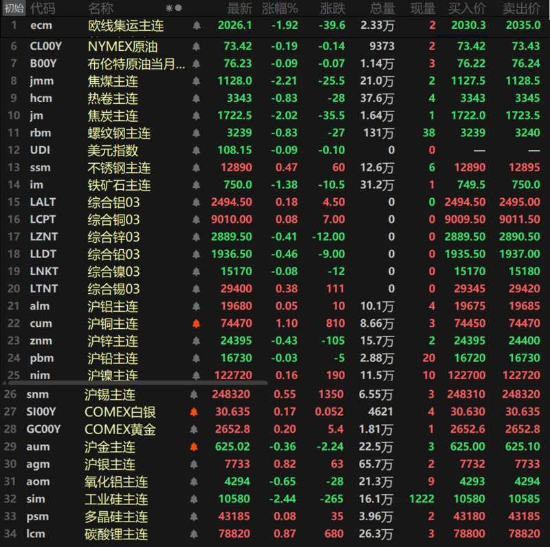 此外,碳酸锂主连涨0.87%,多晶硅涨0.08%,工业硅跌2.44%,欧线集运主连跌1.92%。