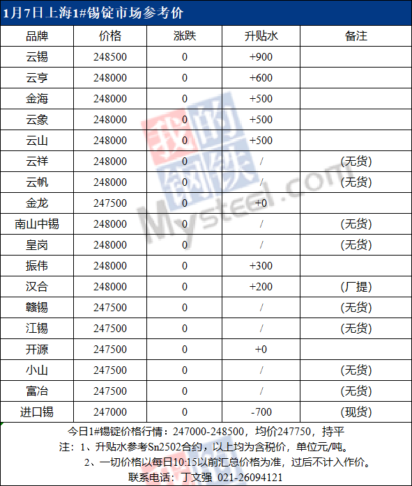 1月7日Mysteel上海现货锡锭报价247000-248500元/吨,均价247750元/吨,较上一交易日持平,Mysteel15:30上海现货锡锭成交价格246500-248500元/吨,均价247500元/吨,较上一交易日涨500元/吨。