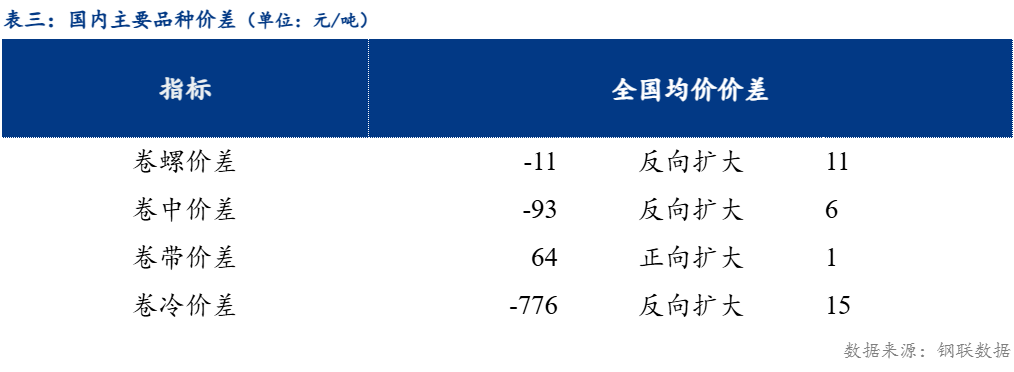 从品种价差来看,卷螺差较上一交易日反向扩大11元/吨,热中价差较上一交易日反向扩大6元/吨,热带价差较上一交易日正向扩大1元/吨,热冷价差较上一交易日反向扩大15元/吨。