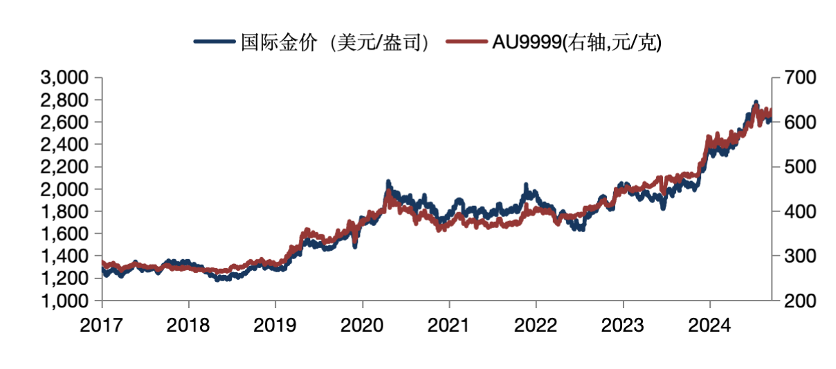 上周国内金价上涨。伦敦现货黄金收于2,639美元/盎司(周环比0.7%),国内AU9999黄金收于627元/克(周环比1.3%)。十年期美债利率下行2个基点至4.60%。