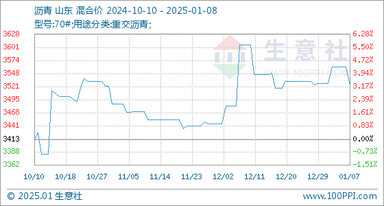1月8日,生意社沥青基准价为3524.00元/吨,与本月初(3528.00元/吨)相比,下降了-0.11%。