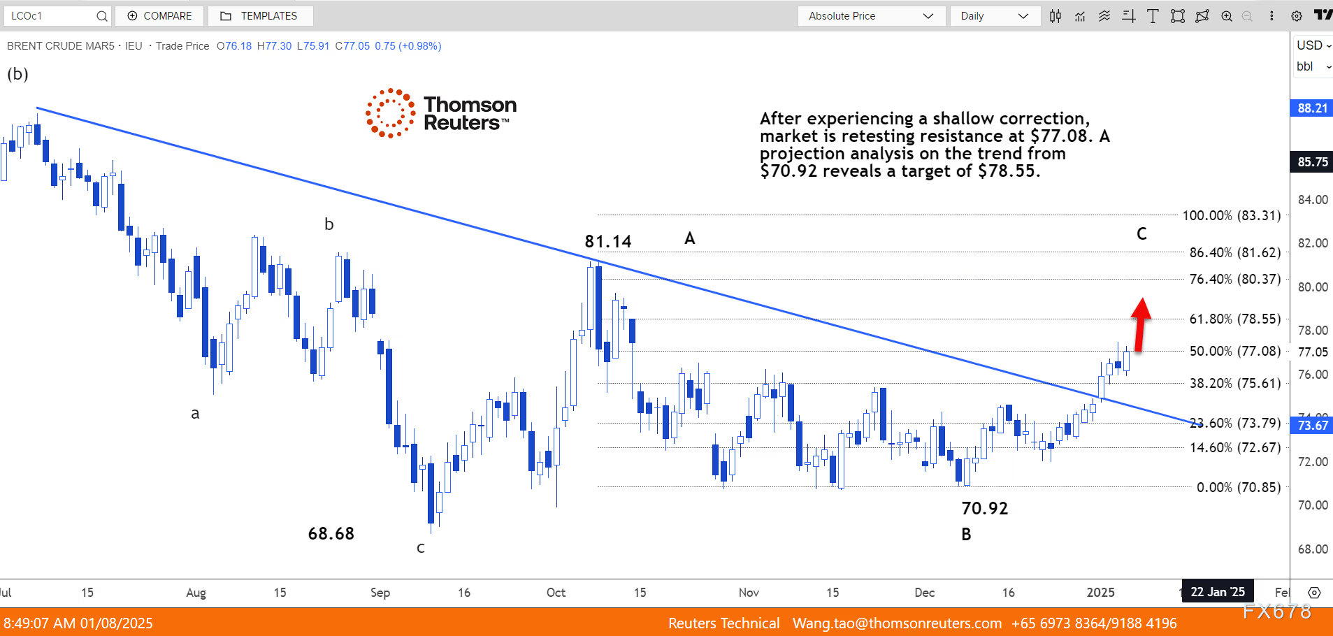 日线图上,市场在经历短暂回调后,重新顶破阻力位 77.08 美元。从 70.92 美元开始的趋势预测分析显示,目标位为 78.55 美元。