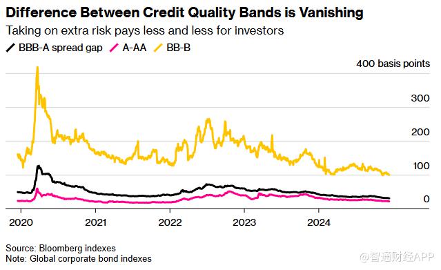 与政府不同,人们对企业资产负债表健康状况的担忧要少得多。投资者对违约风险不以为然,以至于他们不再需要高额溢价来持有风险较高的债券,而垃圾评级的公司正准备利用这一趋势。