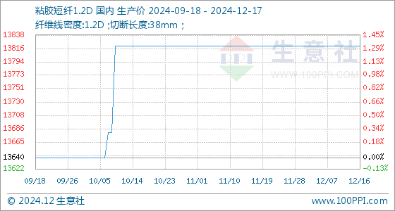 12月17日,生意社粘胶短纤1.2D基准价为13820.00元/吨,与本月初持平。