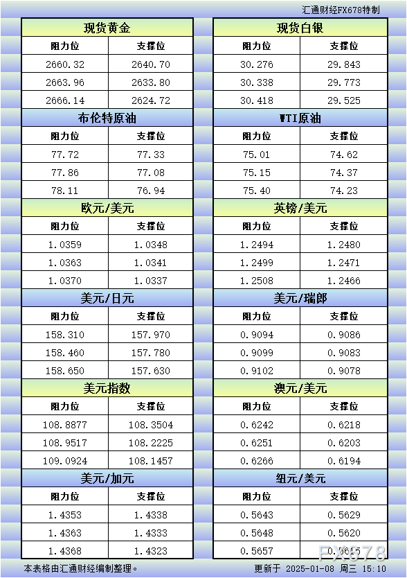 汇通财经APP讯——1月8日欧市更新的黄金、白银、原油、美元指数、欧元、英镑、日元、瑞郎、澳元、加元、纽元支撑阻力位一览。