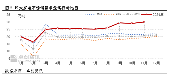 与2024年的“以旧换新”、“国补”等相比,2025年的政策惠及范围和支持力度都有上升。从2024年数据中来看,1-11月,四大家电产品(洗衣机、电视、冰箱、空调)对不锈钢原料的需求量在277.48万吨,较2023年同期增加了21.89%。其对不锈钢原料的需求有显著上升,凸显了政策支持下,家电领域对不锈钢的需求呈现出新的增长趋势。